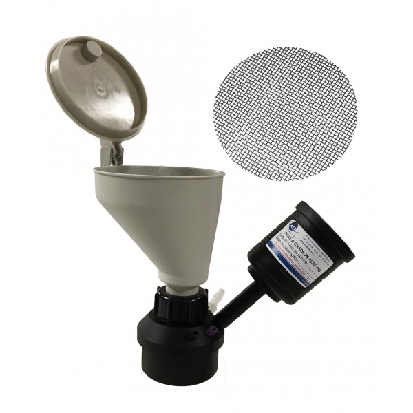 Bouchon avec entonnoir à capôt pour bidon gain de place avec 1 emplacement pour charbon actif, 2 entrées 1/8P et 1 leak grille